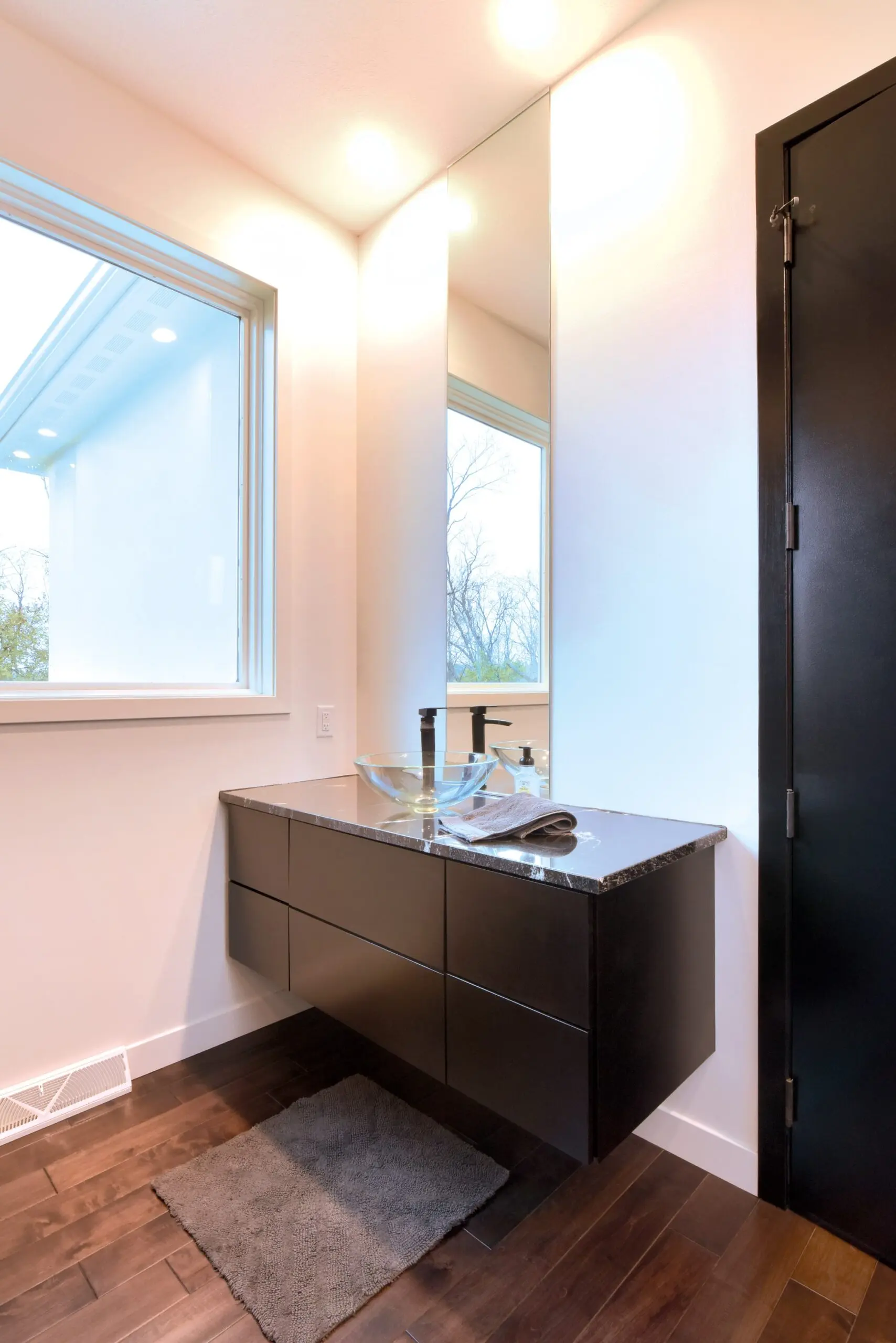 This kitchen achieves simple sophistication through recessed panel cabinetry, a custom hood vent and a large glass pantry. Brushed brass hardware and Cambria quartz countertops add a touch of luxury. The minimalist look is carried into the bathroom with a modern floating vanity featuring a granite top and glass vessel sink.