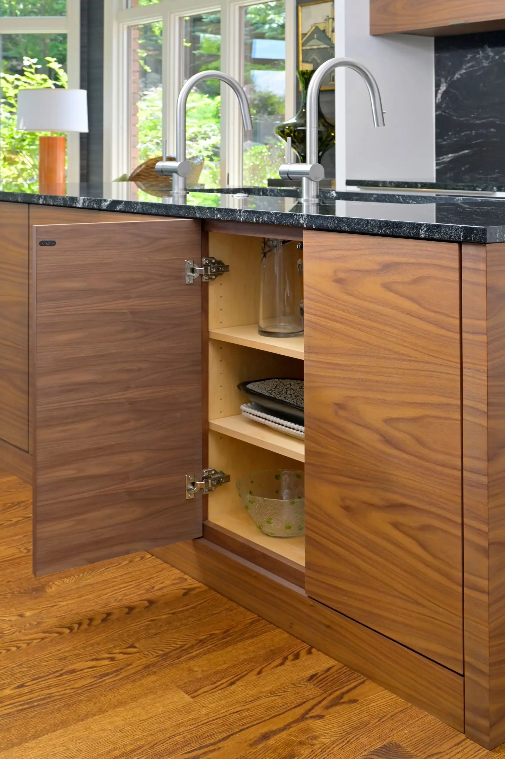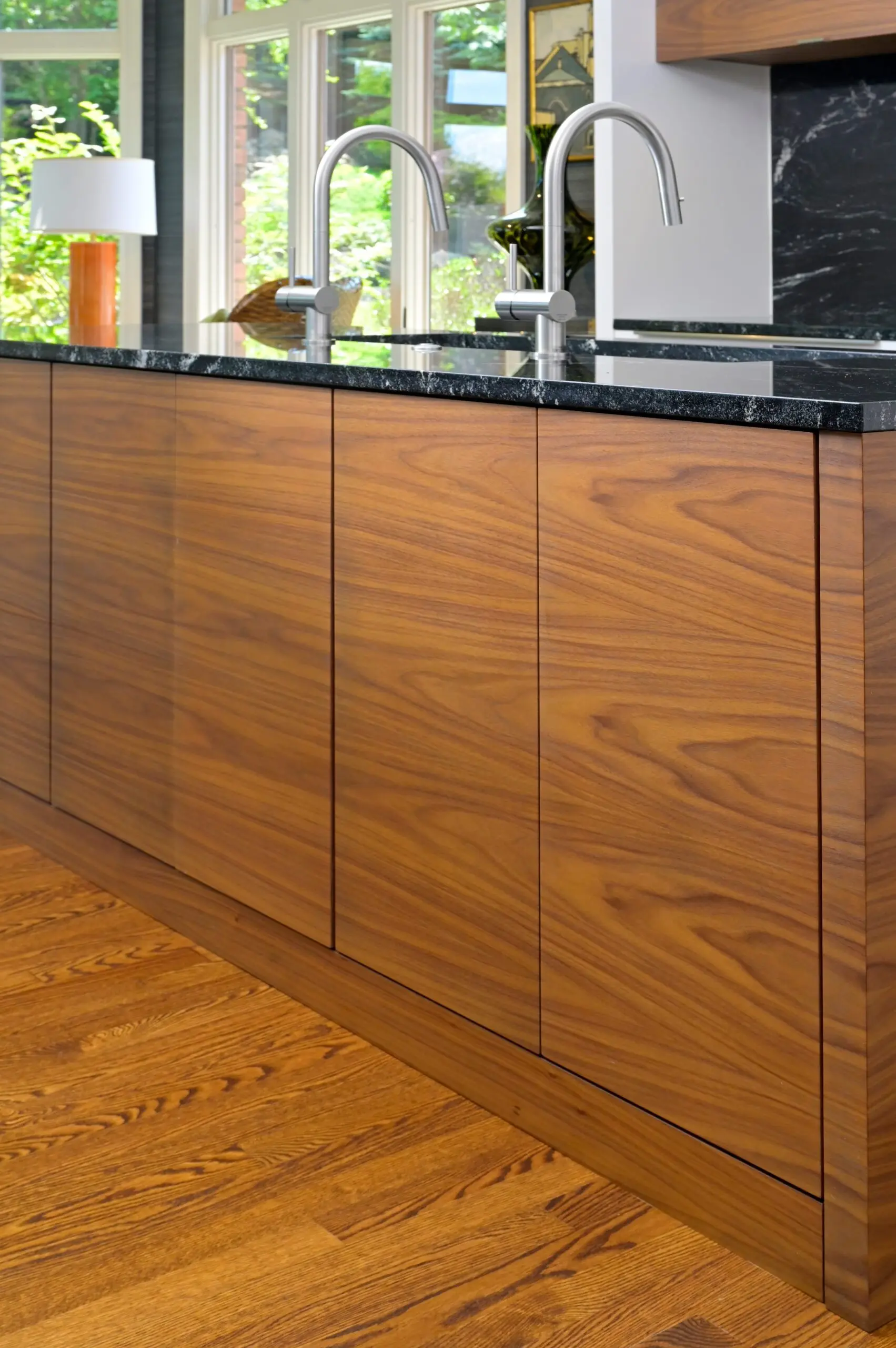 The visual simplicity of the flat panel cabinets are balanced by the rich walnut wood tones. Hidden hardware and matching wood grain complete the streamlined, yet sophisticated, look.